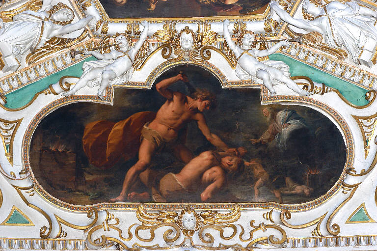 - NOTIZIE STORICO CRITICHE Il dipinto, che illustra il momento in cui Caino uccide il fratello Abele con una clava e l'episodio successivo della maledizione divina (Genesi 4, 1-15), è stato eseguito da Giuseppe Nuvolone. \nNei libri contabili della Misericordia Maggiore, infatti, un appunto datato 30 luglio 1659 riferisce che sono dovute £441 a "D. Giuseppe Panfili pittore ... per il quadro posto nei stucchi, di Caino quando uccise Abele"; altri due pagamenti furono versati all'artista milanese l'11 settembre dello stesso anno (Noris, in "I pittori bergamaschi...Il Seicento", vol. IV, p. 165, scheda 9). \nL'opera è stata probabilmente restaurata da Franco Steffanoni nel 1960; nella relazione in data 24 maggio 1961, si accenna infatti alle operazioni eseguite su "10 dipinti su tela" posti nella navata meridionale, non elencati singolarmente, forse da identificare con quelli collocati sulle volte e sulle pareti del braccio meridionale del transetto (doc. in data 24 maggio 1961, prot. 1232, cat. 5, clas. 6, fasc. 17, Archivio Congregazione Misericordia Maggiore, Bergamo).