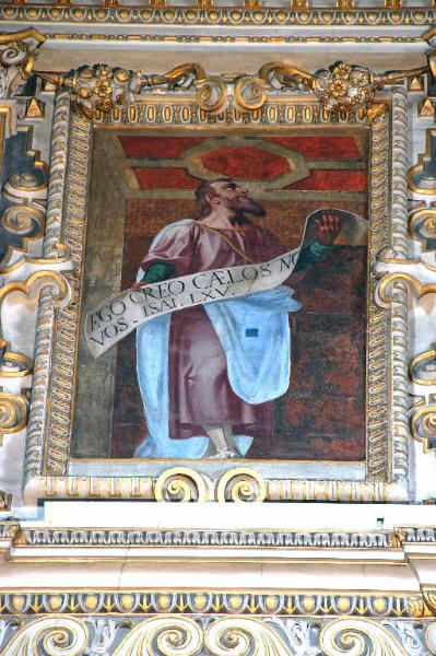- NOTIZIE STORICO CRITICHE La figura di Isaia, come tutte le altre che ornano il tamburo della cupola, è stata eseguita da Giovan Paolo Cavagna tra il 1615 e il 1616 (L. Bandera, in "I pittori bergamaschi...Il Cinquecento", vol. IV, p. 136 e pp. 180-181, scheda 26) .\nL'opera è stata restaurata nel 1961 da Franco Steffanoni (cfr. doc. in data 5/ 12/ 1961, protoc. 2579, pratica 4643, cart. 89, Archivio Congregazione Misericordia Maggiore, Bergamo).
