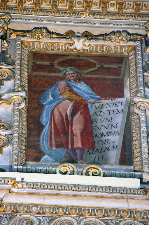 - NOTIZIE STORICO CRITICHE La figura di Malachia, come tutte le altre che ornano il tamburo della cupola, è stata eseguita da Giovan Paolo Cavagna tra il 1615 e il 1616 (L. Bandera, in "I pittori bergamaschi...Il Cinquecento", vol. IV, p. 136 e pp. 180-181, scheda 26) .\nL'opera è stata restaurata nel 1961 da Franco Steffanoni (cfr. doc. in data 5/ 12/ 1961, protoc. 2579, pratica 4643, cart. 89, Archivio Congregazione Misericordia Maggiore, Bergamo).