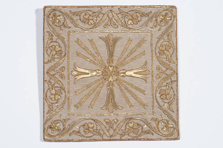 Borsa del corporale in tessuto cannellato avorio ricoperto da una laminatura argento. Ricamo eseguito in oro filato, oro laminato con applicazione di paillettes dorate. Composizioni speculari con ramificazioni terminanti in corolle fiorite incorniciano i lati della borsa; al centro si dispone un fiore a otto petali da cui partono raggi ed elementi vegetali. Fodera in cannellato di seta rosso.