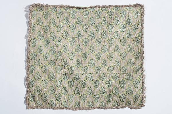 - NOTIZIE STORICO CRITICHE Il velo di calice in esame fa parte di un paramento liturgico. Le ridotte dimensioni del rapporto del disegno, piuttosto stilizzato nella sua caratterizzazione, nonchè la disposizione ripetitiva dello stesso sul fondo, trattato in rigide e geometriche partiture, consentono di identificare il tessuto come un "cannetillé", tipologia tessile di complicata esecuzione tecnica nella quale le coste trasversali sono interrotte e alternate a scacchiera. Il tessuto in esame può essere assegnato all'ultimo quarto del Settecento. Liturgicamente il colore verde è considerato "ordinario". Nel Museo Diocesano di Brescia è conservato un paramento rosso proveniente dalla chiesa parrocchiale di Santa Maria Assunta a Montichiari che presenta un disegno decorativo molto simile: anzichè piccoli mazzi all'interno della trama romboidale ci sono coppie di fiori ("Indue me Domine", 1998, pp. 102, 159).