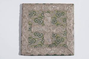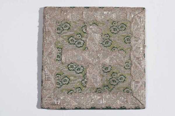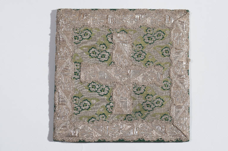 Borsa del corporale in seta cannetillé color verde chiaro ricoperta da una laminatura argento. Il motivo decorativo, di ridotte dimensioni modulari, è articolato in piccole partiture romboidali schiacciate. All'interno di questo elegante traillage, su di un fondo trattato a spina di pesce dalle diagonali argento, sono disposti mazzi di fiori alternativamente rivolti verso destra e sinistra. La borsa è ornata da galloni eseguiti a telaio in argento filato e argento laminato. Fodera in seta verde.
