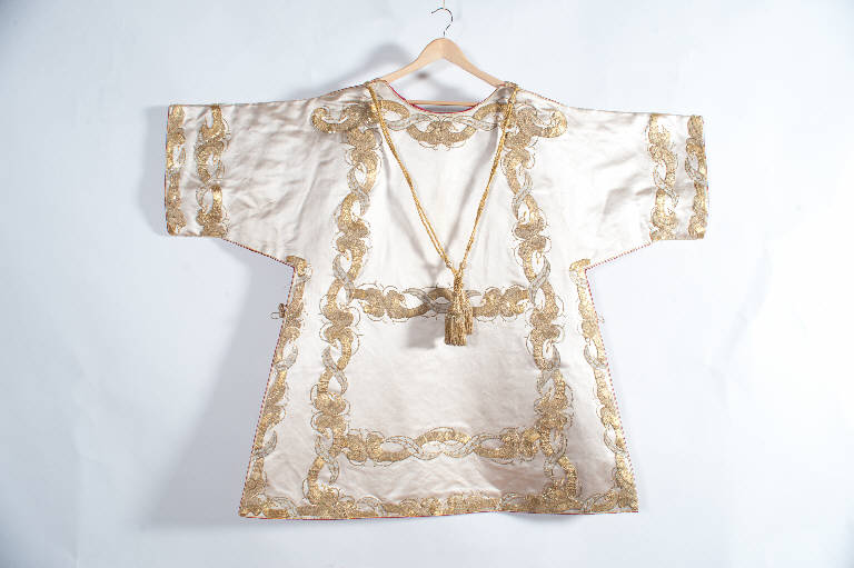- NOTIZIE STORICO CRITICHE Le tunicelle in esame fanno parte di un paramento liturgico. I ricami in argento laminato, oro filato e canutiglia oro con applicazione di paillettes dorate e borchiette sono riportati su un supporto in raso di seta bianco confezionato in epoca recente: sono concentrati lungo le cuciture della veste e sostituiscono visivamente l'applicazione del gallone. Il disegno, che presenta lo svolgersi ad "8" di coppie di racemi a voluta d'oro tangenti e speculari, è una rielaborazione in chiave classicista di modelli più antichi. Il carattere stilizzato e ripetitivo del motivo vegetale, ben lontano dal vivezza e dal naturalismo dei modelli settecenteschi, indica una datazione alla prima metà del secolo successivo ad opera di una manifattura locale.
