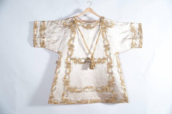 Coppia di tunicelle in raso bianco. I motivi a riporto, eseguiti in argento laminato, oro filato e canutiglia oro con applicazione di paillettes dorate e borchiette, sono posizionati lungo il perimetro e all'interno e sostituiscono visivamente l'applicazione del gallone. Si tratta di un disegno che presenta lo svolgersi ad "8" di coppie di racemi a voluta d'oro tangenti e speculari. Fodera in gros de Tours di seta rosso. Nappe in oro filato.