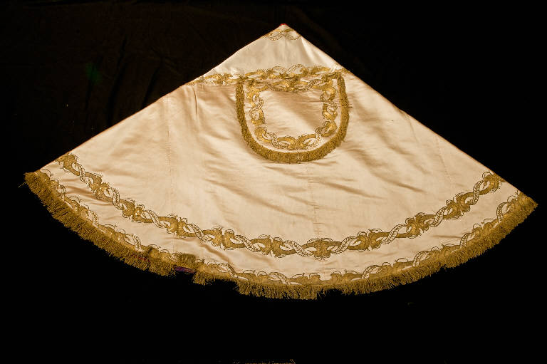 - NOTIZIE STORICO CRITICHE Il piviale in esame fa parte di un paramento liturgico. I ricami in argento laminato, oro filato e canutiglia oro con applicazione di paillettes dorate e borchiette sono riportati su un supporto in raso di seta bianco confezionato in epoca recente: sono concentrati lungo le cuciture della veste e sostituiscono visivamente l'applicazione del gallone. Il disegno, che presenta lo svolgersi ad "8" di coppie di racemi a voluta d'oro tangenti e speculari, è una rielaborazione in chiave classicista di modelli più antichi. Il carattere stilizzato e ripetitivo del motivo vegetale, ben lontano dal vivezza e dal naturalismo dei modelli settecenteschi, indica una datazione alla prima metà del secolo successivo ad opera di una manifattura locale.