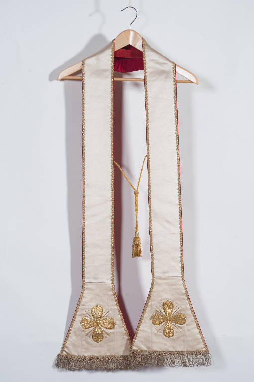 Tre stole in raso bianco. I motivi a riporto sono posizionati a metà della lunghezza e nelle terminazioni trapezoidali. Si tratta di croci raggiate eseguite in oro filato e canutiglia oro con applicazione di paillettes dorate e borchiette. Fodera in gros de Tours di seta rosso. Nappa in oro filato.