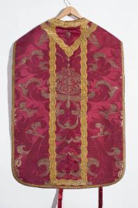 Pianeta in damasco con broccatura in argento filato. Il disegno incompleto, costituito da una grande infiorescenza centrale nascente da ampie foglie acantiformi, si struttura in maniera speculare rispetto all'asse mediano. Disegno rosso su fondo rosso con motivi vegetali e floreali in argento. Ornano la pianeta piccoli galloni a motivi geometrici e galloni a torciglione eseguiti a telaio in oro filato e oro laminato. Fodera in tessuto di seta rosso.