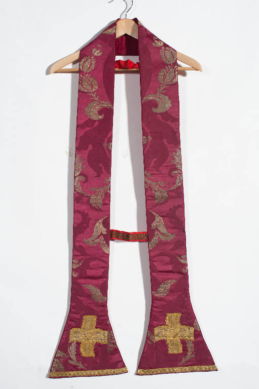 Stola in damasco con broccatura in argento filato. Il disegno incompleto, costituito da ampie foglie acantiformi, si struttura in maniera speculare rispetto all'asse mediano. Disegno rosso su fondo rosso con motivi vegetali e floreali in argento. Ornano la stola piccoli galloni a motivi geometrici e galloni a torciglione eseguiti a telaio in oro filato e oro laminato. Fodera in tessuto di seta rosso.