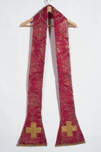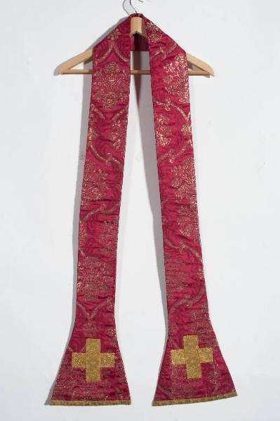 Stole in damasco con broccatura in argento filato. Sul fondo rosso spiccano foglie dentate e volute incrociate a formare una rete a scomparti romboidali entro i quali vengono disposti vasi di fiori; in corrispondenza dei due vertici laterali è disposto un fiore a otto petali. Ornano le stole galloni eseguiti a telaio in oro filato e oro laminato. Fodera in taffetas di seta rosso.