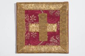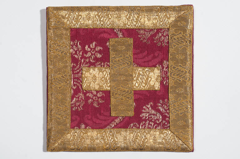 - NOTIZIE STORICO CRITICHE Le tre borse del corporale in esame, appartenenti ad un paramento (num. foto 1186), sono realizzate in damasco rosso. Nella liturgia tale colore, da sempre associato al sangue e al fuoco, è usato nella solennità della Pentecoste, nella Domenica delle Palme, nel Venerdì Santo, nella festa dell'esaltazione della Croce, nelle feste degli Apostoli e nelle commemorazioni dei martiri. La complessa lavorazione in broccato argento è stata effettuata tessendo al rovescio dove risulta più facile gestire gli intrecci delle trame. Lo schema a maglie del disegno, che imposta la regolare composizione secondo forme ordinate entro le quali troviamo vasi di fiori, si richiama al gusto tessile seicentesco italiano e può essere considerato nell'ambito del revival ottocentesco dei tessuti antichi. L'uniformità della tecnica esecutiva non consente di avanzare precise indicazioni circa la paternità del tessuto, attribuito perciò ad una generica manifattura italiana.