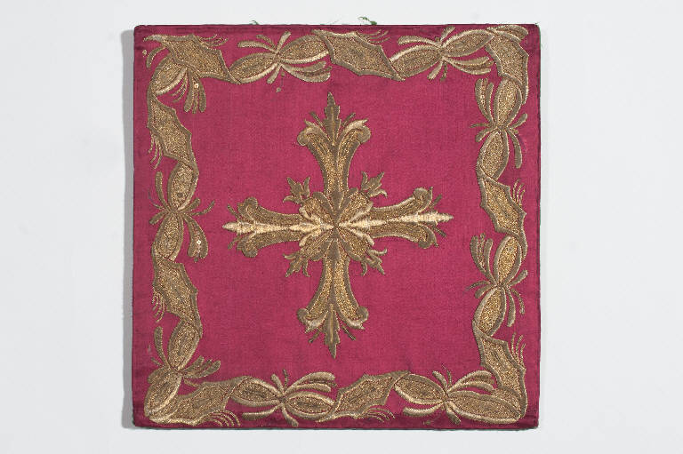 - NOTIZIE STORICO CRITICHE La borsa del corporale in esame, appartenente ad un paramento liturgico, è in raso rosso con ricami eseguiti in oro filato con applicazione di paillettes. Il disegno decorativo presenta lo svolgersi di un nastro dall'andamento sinuoso che si intreccia con motivi vegetali. L'estrema semplificazione e linearità del ricamo unita alla rigida collocazione dei motivi, che sostituiscono visivamente l'applicazione del gallone, fanno ipotizzare una realizzazione presso un laboratorio locale nel secondo quarto dell'Ottocento.