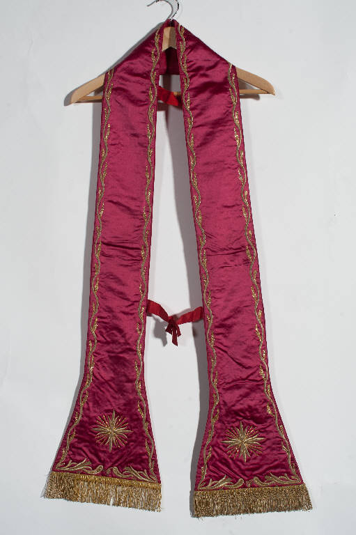 Stola in raso rosso. Il ricamo decorativo, eseguito in oro filato, oro laminato e canutiglia oro con applicazione di paillettes dorate, si sviluppa lungo i margini perimetrali sostituendo visivamente l'applicazione del gallone. Si tratta di un disegno che presenta lo svolgersi sinuoso di racemi vegetali. Fodera in taffetas di seta rosso.