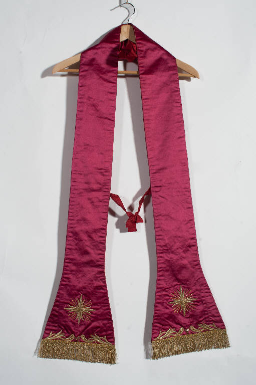 Stola in raso rosso. Il ricamo decorativo, eseguito in oro filato, oro laminato e canutiglia oro con applicazione di paillettes dorate, si sviluppa lungo il lato più lungo delle terminazioni trapezoidali sostituendo visivamente l'applicazione del gallone. Si tratta di un disegno che presenta lo svolgersi sinuoso di racemi vegetali. Fodera in taffetas di seta rosso.