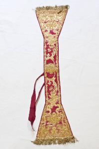 Manipolo in raso rosso. Il ricchissimo ricamo, eseguito in oro filato e oro laminato con applicazione di paillettes, assume un'ampia struttura centralizzata che occupa tutta la superficie del tessuto. Il disegno si sviluppa dal basso verso l'alto con tralci d'acanto contrapposti e speculari nella direzione che si allargano in ampi girali con fiori e foglie d'acanto. Fodera in tessuto rosso.