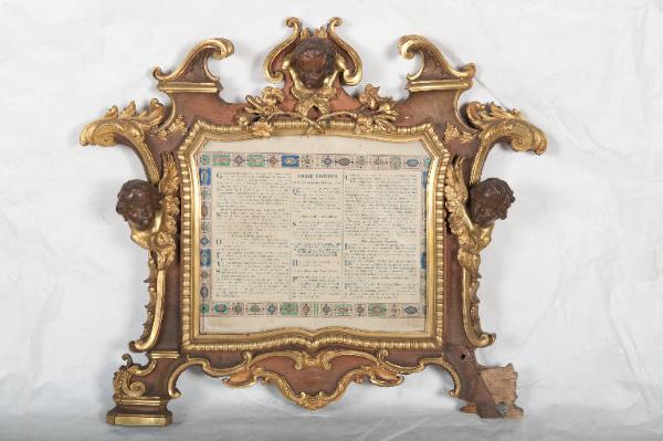 Cartagloria centrale in metallo argentato e dorato. Piedini a gradini. Cornice mistilinea delimitata da volute fitomorfe decorata con gigli, foglie d'acanto e tre teste di cherubino realizzate a fusione poste ai lati della cartella e al centro del fastigio; cornice della cartella ornata da una teoria di ovoli.