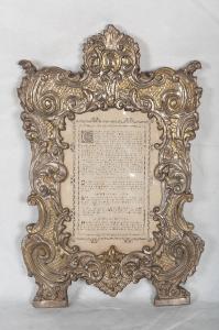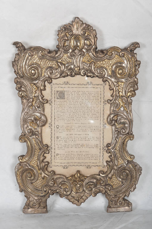 Coppia di cartagloria centrali in metallo argentato e dorato. Piedini impostati su fascia liscia. Cornice mistilinea delimitata da volute fitomorfe decorata con racemi vegetali, foglie d'acanto e volute trattate a reticolato; cornice della cartella rifinita da volute acantiformi.