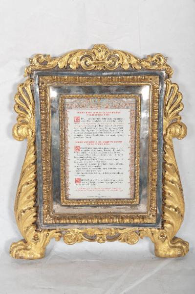 Coppia di cartagloria laterali in metallo argentato e dorato. Piedini a zampa di leone. Cornice mistilinea con racemi vegetali terminanti in fiori, foglie d'acanto e volute; cornice rettangolare della cartella rifinita all'esterno da una teoria di ovoli e all'interno da una teoria di foglie lanceolate.