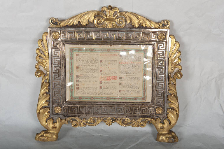 Cartagloria centrale in metallo argentato e dorato. Piedini a zampa di leone. Cornice mistilinea con racemi vegetali terminanti in fiori, foglie d'acanto e volute; cornice rettangolare della cartella decorata con greca a meandro e fiori a quattro petali agli angoli.