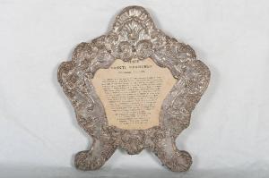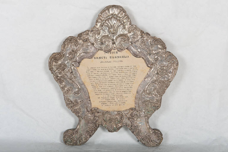 - NOTIZIE STORICO CRITICHE La coppia di cartagloria di esame fa parte di un servizio (num. foto 1340). L'ipotesi di una datazione al terzo quarto del Settecento sarebbe confermata dal carattere sostanzialmente tardobarocco del partito decorativo costituito dal tipico combinarsi di volute, valve di conchiglia, foglie d'acanto, racemi vegetali e fiori. L'interpretazione di tale apparato ornamentale appare difatti piuttosto rigida, convenzionale, propria di una rielaborazione tarda.
