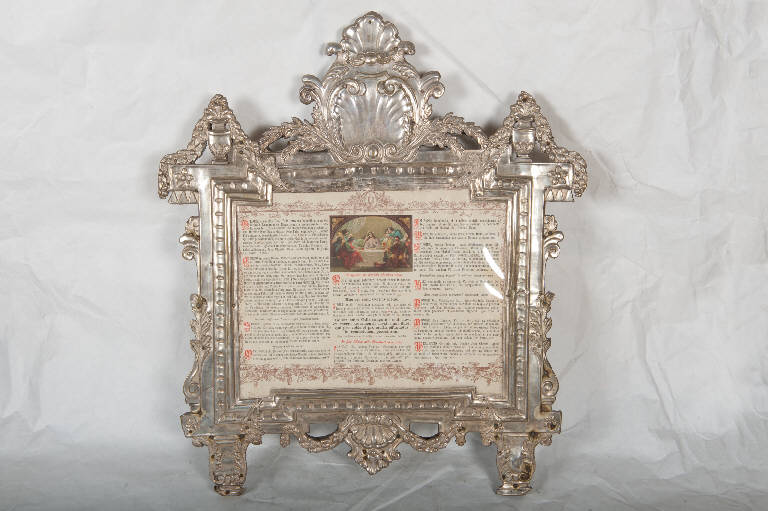 Cartagloria centrale in metallo argentato. Piedini impostati su zoccoli ornati da foglie d'acanto; cornice rettangolare con fastigio decorato da racemi vegetali, fiori, vasi, festoni, volute e valve di conchiglia.