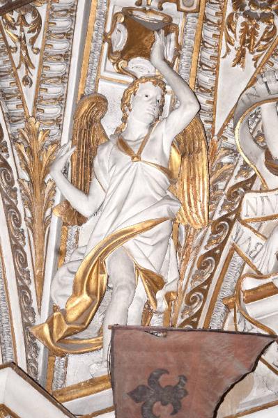 Figura di angelo in funzione di cariatide, con il braccio sinistro alzato.