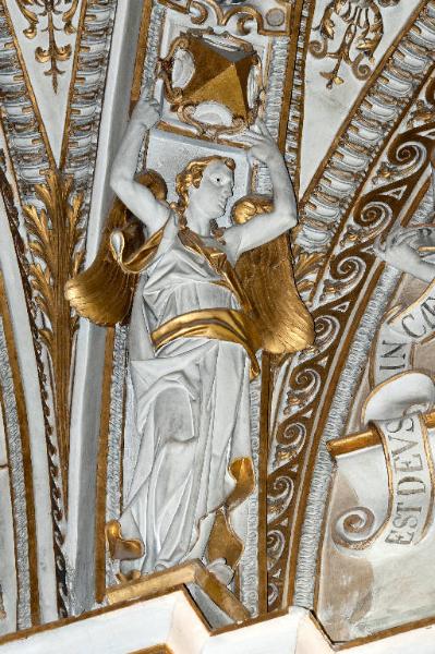 Figura di angelo in funzione di cariatide, con entrambe le braccia alzate.