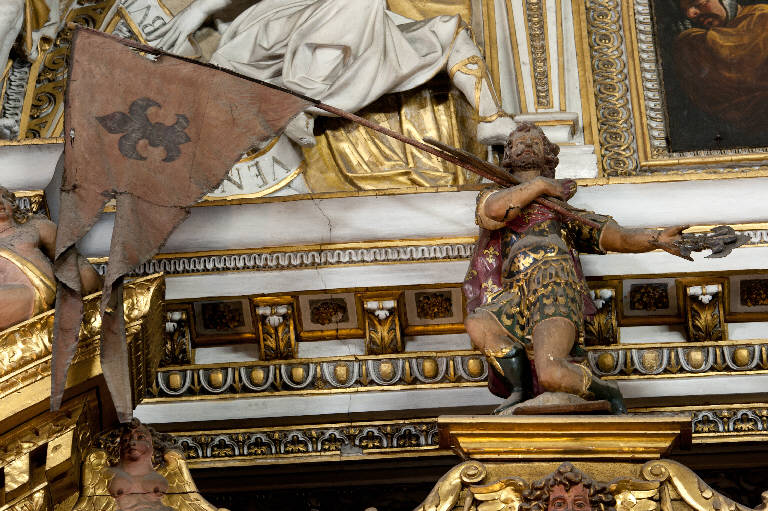 Statua di Sant'Alessandro con stendardo e armatura posta al centro dell'architrave della cassa d'organo.