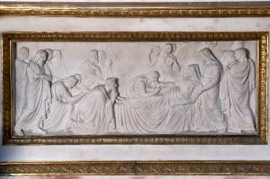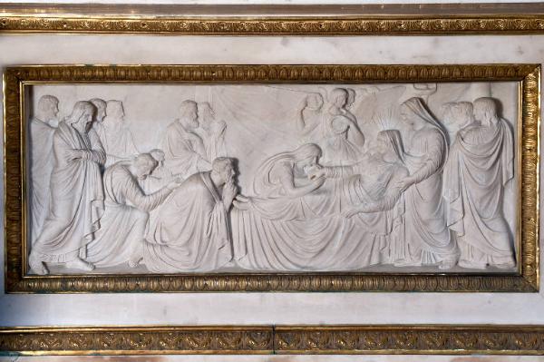 Paliotto in marmo bianco collocato sotto la mensa dell'altare maggiore. Raffigura il transito della Madonna.