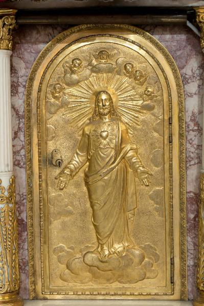 Lo sportello in rame dorato e sbalzato è incernierato al tabernacolo dell'altare maggiore. Raffigura il "Sacro Cuore di Gesù".