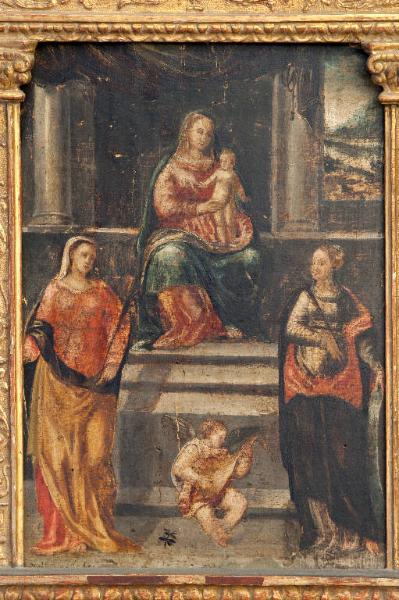- NOTIZIE STORICO CRITICHE Non si sa molto di questa tavola raffigurante una "Madonna con Bambino in trono con Santa Caterina d'Alessandria e Santa martire" inserita al centro di un oratorio domestico di piccole dimensioni riferibile, con ogni probabilità, ad un ambito lombardo-veneto della prima metà del Cinquecento (num. foto 1080).