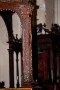 Pilastrino intagliato su tre facce con motivi a candelabra nei quali, tra i racemi vegetali, si alternano mascheroni, bucrani, vasi, uccelli, frutti e un piccolo dromedario sulla faccia verso l'esterno; la faccia verso l'interno del coro è decorata prevalentemente con girali vegelati; il capitello è di tipo composito con foglie di acanto che fasciano il calato e, in alto, al posto dell'echino due teste di delfino ai lati di un uccellino; sulla faccia interna alla bifora è addossata una semicolonna tornita e intagliata con un fregio e un festone.