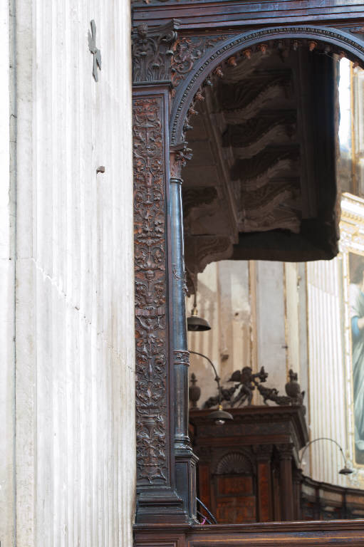 Pilastrino intagliato sulle due facce principali con motivi a candelabra nei quali, tra i racemi vegetali, si alternano figure zoomorfe fantastiche, vasi, una figura che sostiene un libro con le braccia alzate, un cherubino (faccia verso l'esterno), il busto di una figura maschile, un cherubino, vasi e un cerbiatto (faccia verso l'interno del coro); i capitelli sulle due facce sono di tipo composito con foglie di acanto che fasciano il calato e testine al centro in alto; sulle facce minori, interne alle bifore, sono addossate due semicolonne tornite e intagliate con fregi e festoni.