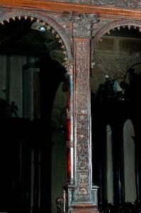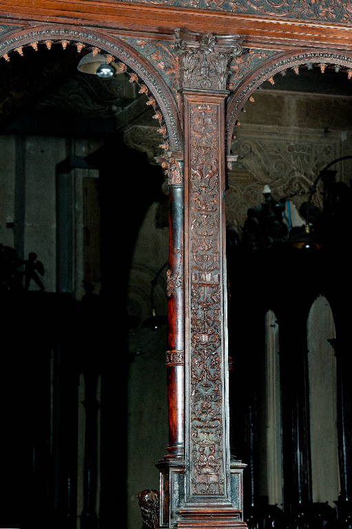 Pilastrino intagliato sulle due facce principali con motivi a candelabra nei quali, tra i racemi vegetali, si alternano figure maschili sedute con elmo, libri, fenicotteri, aquila ad ali spiegate e fruttiera (faccia verso l'esterno), figura accovacciata con mani giunte, figure zoomorfe fantastiche, mascherone e cherubino (faccia verso l'interno del coro); i capitelli sulle due facce sono di tipo composito con foglie di acanto che fasciano il calato e, sull'echino, volute, mascherone, un busto di figura femminile e fiori; sulle facce minori, interne alle bifore, sono addossate due semicolonne tornite e intagliate con fregi e festoni.