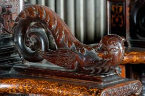 Bracciolo di stallo di coro costituito dalla figura scolpita di un animale fantastico avente la testa di delfino con corna attorcigliate, il corpo di uccello e la coda arrotolata di un serpente; una lunga foglia si sovrammette alla coda e al becco del pesce.