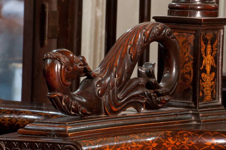 - NOTIZIE STORICO CRITICHE I braccioli fanno parte dei sedili del coro commissionato nel 1522 dal Consorzio della Misericordia Maggiore di Bergamo al legnaiolo e intarsiatore loverese Giovanni Francesco Capoferri, al quale, alla fine di ottobre, fu affiancato il marangone Giovanni Belli di Ponteranica per i lavori di intaglio. Il progetto della struttura del coro fu messo a punto dallo stesso Capoferri che visitò varie città del Nord-Italia per vedere altri cori intarsiati e che nel luglio-agosto 1523 si recò più volte a Milano dal pittore e architetto trevigliese Bernardo Zenale per sottoporgli il modello del coro. I cartoni delle tarsie figurative che ornano il coro furono affidate in un primo momento (29 ottobre 1523) al poco noto pittore bergamasco Nicolino Cabrini che morì poco dopo: il 12 marzo 1524 fu incaricato al suo posto Lotto, a cui il 2 giugno 1524 il Consorzio richiese anche i pannelli intarsiati ("coperti") che dovevano proteggere le preziose tavolette, i cui soggetti dovevano essere indicati dal principale teologo della città, fra Girolamo Terzi.\nLa struttura del coro è in legno di noce, salvo l'ossatura in legno di conifera. I primi acquisti di legname risalgono al 1523 (cfr. il "Liber fabrice Chori"): insieme al giovanissimo figlio Alessandro, l'intagliatore Giovanni Belli realizzò gran parte della struttura e molte delle decorazioni intagliate. I Belli furono coadiuvati da altri intagliatori, tra cui si annovera per l'esecuzione degli animali fantastici della cimasa negli anni 1525-1526 l'intagliatore Pietro Maffeis da Stabello, di cui si ha notizia di una sola altra opera, un'ancona per la chiesa di Sant'Antonio a Sedrina, andata perduta (1510). Anche il ben più noto scultore e intagliatore milanese Pietro Bussolo è documentato aver realizzato nel 1525-1526 "unum canem ligneum nucis" e "unum monstrum marinum ligneum cum facie leonis", nonché "aliud simile monstrum", che potrebbero essere riconosciuti nelle sculture della cimasa o nei mostri dei braccioli dei sedili. Per i braccioli risultano specifici pagamenti effettuati ad Alessandro Belli e a Giacomo Alberti negli anni 1531-1532. Come molti altri disegni per le decorazioni del coro, i disegni per i braccioli furono allogati nel dicembre 1524 al pittore Domenico Petengi d'Albano, ma risulta che anche il pittore Lucano da Imola fornì nove disegni per i braccioli (1532). Alla morte di Giovanni Belli nel 1530 i lavori strutturali e di intaglio erano sostanzialmente finiti, salvo alcuni ulteriori interventi di completamento che sarebbero stati ultimati nel gennaio 1532.\nNel 1531 fu deciso di ampliare la struttura del coro, trasferendo le tarsie istoriate del coro degli ecclesiastici ai due bancali dei celebranti e dei Rettori e al coro dei laici nell'abside: nel coro degli ecclesiastici rimasero i soli 'coperti' di soggetto simbolico. Nell'ottobre del 1533, consegnati dal Capoferri gli ultimi pannelli intarsiati, risultano già collocate negli stalli del coro dei religiosi le tarsie 'simboliche' degli ex-coperti, mentre le altre tarsie istoriate sarebbero rimaste per vent'anni nei depositi della Misericordia Maggiore.\nEsiste un bracciolo molto simile a quello in oggetto sul braccio del coro a destra.