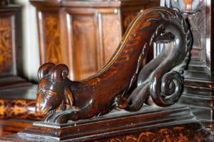 Bracciolo di stallo di coro costituito dalla figura scolpita di un animale fantastico con testa e arti anteriori di capro con corna arricciate, coda doppia resa da due serpenti attorcigliati che mordono sul ventre l'animale; foglie d'acanto fasciano le spire dei serpenti.