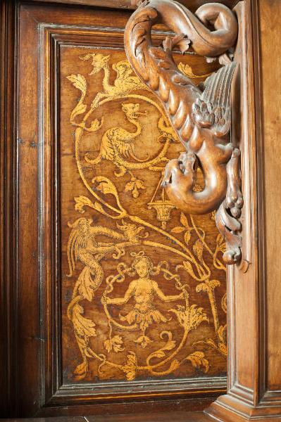 Pannello intarsiato seminascosto dalla credenza del presbiterio: motivi decorativi a grottesca caratterizzati da grandi girali tra i quali compaiono vari elementi fantastici come draghi, un busto di donna nuda, un putto che cavalca una tartaruga.