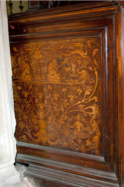 Pannello intarsiato seminascosto da uno dei quattro pilastri del presbiterio: motivi decorativi a grottesca caratterizzati da grandi girali che si dipartono dalle braccia aperte di una figura femminile nuda al centro; tra i girali compaiono vari elementi fantastici come due putti che cavalcano tartarughe, draghi, lampade pensili, un'altro busto di figura femminile nuda.