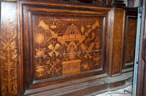 Pannello intarsiato ornato con un badalone di coro al centro da cui si dipartono vari oggetti liturgici disposti in modo simmetrico e legati con nastri: torce processionali, calici, ampolline, pissidi, un secchiello per acqua benedetta con aspersorio, una brocca, un bacile, candelieri, lampade pensili, un candeliere da parete, una navicella portaincenso con cucchiaino, una mazza processionale.