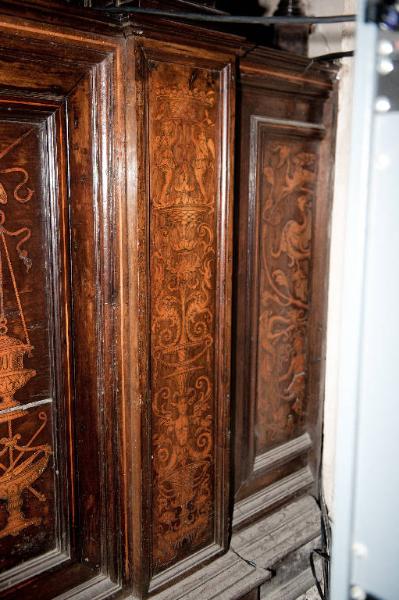 - NOTIZIE STORICO CRITICHE Il piedistallo intarsiato fa parte del coro commissionato nel 1522 dal Consorzio della Misericordia Maggiore di Bergamo al legnaiolo e intarsiatore loverese Giovanni Francesco Capoferri, al quale, alla fine di ottobre, fu affiancato il marangone Giovanni Belli di Ponteranica per i lavori di intaglio. Il progetto della struttura del coro fu messo a punto dallo stesso Capoferri che visitò varie città del Nord-Italia per vedere altri cori intarsiati e che nel luglio-agosto 1523 si recò più volte a Milano dal pittore e architetto trevigliese Bernardo Zenale per sottoporgli il modello del coro. I cartoni delle tarsie figurative che ornano il coro furono affidate in un primo momento (29 ottobre 1523) al poco noto pittore bergamasco Nicolino Cabrini che morì poco dopo: il 12 marzo 1524 fu incaricato al suo posto Lotto, a cui il 2 giugno 1524 il Consorzio richiese anche i pannelli intarsiati ("coperti") che dovevano proteggere le preziose tavolette, i cui soggetti dovevano essere indicati dal principale teologo della città, fra Girolamo Terzi.\nLa struttura del coro è in legno di noce, salvo l'ossatura in legno di conifera. I primi acquisti di legname risalgono al 1523 (cfr. il "Liber fabrice Chori"): insieme al giovanissimo figlio Alessandro, l'intagliatore Giovanni Belli realizzò gran parte della struttura e molte delle decorazioni intagliate. Nel dicembre 1524 il pittore Domenico Petengi d'Albano fu incaricato di realizzare molti dei disegni per gli intagli e le sculture presenti nel coro, ma anche per le tarsie ad arabeschi o a candelabra che andarono a ornare le parti minori del coro: in particolare preparò i cartoni per i pannelli medi e piccoli degli stalli e dell'iconostasi e per i pannelli grandi posti a decorazione del retro del recinto del coro. Nel 1530 anche i pittori Lucano da Imola e Giacomo da Castione fornirono disegni per altri arabeschi intarsiati e ne curarono la profilatura, cioè la rifinitura con tracce grafiche per il completamento del disegno. Anche il Petengi era intervenuto nella profilatura delle tarsie da lui disegnate ma "con grafia alquanto pesante, uniforme e talvolta approssimativa" (Cortesi Bosco, p. 24). La realizzazione di queste tarsie minori spettava al Capoferri, aiutato da altri intasiatori come Paolino da Treviglio che nel 1524 eseguì quattro mezze colonne intarsiate (forse quelle del fronte dell'iconostasi), probabilmente Angelo Ferri, giovane aiuto del Capoferri che morì precocemente durante la peste del 1529 e altri artefici come Alessandro Belli, Giacomo Alberti e Giovan Maria de Marendis, allievo dell'intarsiatore fra Damiano Zambelli. Difficile distinguere, tuttavia, le singole mani nelle varie tarsie decorative del coro. In una lettera del settembre 1527 Lotto diede il suo parere circa il tipo di decorazioni intarsiate da porre sulla parte retrostante del recinto del coro: tali decorazioni dovevano essere "a finto trasforato" con elegante effetto illusionistico, ma, forse perché l'esecuzione dei pannelli era già stata iniziata, il consiglio rimase inascoltato.\nNel 1531 fu deciso di ampliare la struttura del coro, trasferendo le tarsie istoriate del coro degli ecclesiastici ai due bancali dei celebranti e dei Rettori e al coro dei laici nell'abside: nel coro degli ecclesiastici rimasero i soli 'coperti' di soggetto simbolico. Nell'ottobre del 1533, consegnati dal Capoferri gli ultimi pannelli intarsiati, risultano già collocate negli stalli del coro dei religiosi le tarsie 'simboliche' degli ex-coperti, mentre le altre tarsie istoriate sarebbero rimaste per vent'anni nei depositi della Misericordia Maggiore.