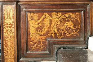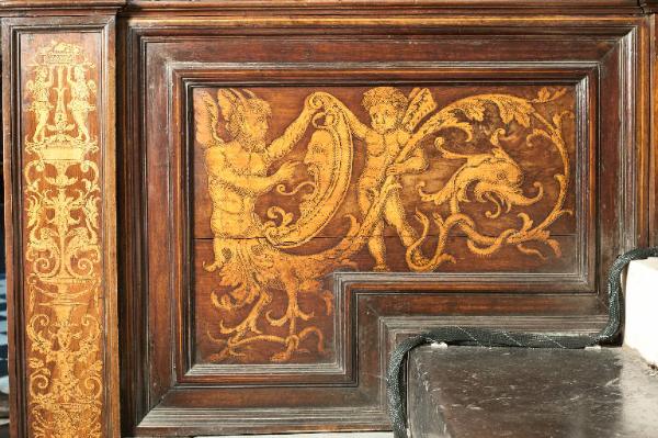 Pannello intarsiato ornato con una figura fantastica con busto d'uomo alato, zampe d'uccello e coda a voluta fogliacea terminante con testa di delfino; un putto con ali di farfalla mostra alla figura un elmo con mascherone con lingua arrotolata.