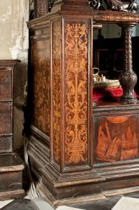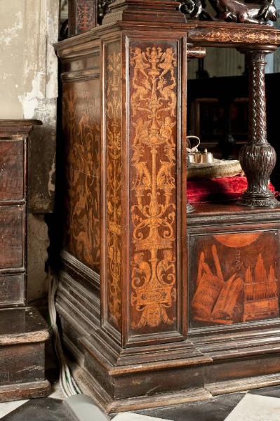 Piedistallo parallelepipedo posto all'estremità sinistra del braccio destro del coro. Pannelli intarsiati decorati a candelabra su tre facce: su quella interna alla porta,sulla base e lungo il fusto del candelabro, compaiono mascheroni, coppie di animali fantastici, coppie di putti alati con violini e corni; sulla faccia verso la navata un fauno che sorregge la base del candelabro, animali fantastici, mascheroni, teste di delfino.