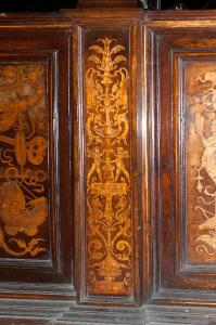 - NOTIZIE STORICO CRITICHE Il piedistallo intarsiato fa parte del coro commissionato nel 1522 dal Consorzio della Misericordia Maggiore di Bergamo al legnaiolo e intarsiatore loverese Giovanni Francesco Capoferri, al quale, alla fine di ottobre, fu affiancato il marangone Giovanni Belli di Ponteranica per i lavori di intaglio. Il progetto della struttura del coro fu messo a punto dallo stesso Capoferri che visitò varie città del Nord-Italia per vedere altri cori intarsiati e che nel luglio-agosto 1523 si recò più volte a Milano dal pittore e architetto trevigliese Bernardo Zenale per sottoporgli il modello del coro. I cartoni delle tarsie figurative che ornano il coro furono affidate in un primo momento (29 ottobre 1523) al poco noto pittore bergamasco Nicolino Cabrini che morì poco dopo: il 12 marzo 1524 fu incaricato al suo posto Lotto, a cui il 2 giugno 1524 il Consorzio richiese anche i pannelli intarsiati ("coperti") che dovevano proteggere le preziose tavolette, i cui soggetti dovevano essere indicati dal principale teologo della città, fra Girolamo Terzi.\nLa struttura del coro è in legno di noce, salvo l'ossatura in legno di conifera. I primi acquisti di legname risalgono al 1523 (cfr. il "Liber fabrice Chori"): insieme al giovanissimo figlio Alessandro, l'intagliatore Giovanni Belli realizzò gran parte della struttura e molte delle decorazioni intagliate. Nel dicembre 1524 il pittore Domenico Petengi d'Albano fu incaricato di realizzare molti dei disegni per gli intagli e le sculture presenti nel coro, ma anche per le tarsie ad arabeschi o a candelabra che andarono a ornare le parti minori del coro: in particolare preparò i cartoni per i pannelli medi e piccoli degli stalli e dell'iconostasi e per i pannelli grandi posti a decorazione del retro del recinto del coro. Nel 1530 anche i pittori Lucano da Imola e Giacomo da Castione fornirono disegni per altri arabeschi intarsiati e ne curarono la profilatura, cioè la rifinitura con tracce grafiche per il completamento del disegno. Anche il Petengi era intervenuto nella profilatura delle tarsie da lui disegnate ma "con grafia alquanto pesante, uniforme e talvolta approssimativa" (Cortesi Bosco, p. 24). La realizzazione di queste tarsie minori spettava al Capoferri, aiutato da altri intasiatori come Paolino da Treviglio che nel 1524 eseguì quattro mezze colonne intarsiate (forse quelle del fronte dell'iconostasi), probabilmente Angelo Ferri, giovane aiuto del Capoferri che morì precocemente durante la peste del 1529 e altri artefici come Alessandro Belli, Giacomo Alberti e Giovan Maria de Marendis, allievo dell'intarsiatore fra Damiano Zambelli. Difficile distinguere, tuttavia, le singole mani nelle varie tarsie decorative del coro. In una lettera del settembre 1527 Lotto diede il suo parere circa il tipo di decorazioni intarsiate da porre sulla parte retrostante del recinto del coro: tali decorazioni dovevano essere "a finto trasforato" con elegante effetto illusionistico, ma, forse perché l'esecuzione dei pannelli era già stata iniziata, il consiglio rimase inascoltato.\nNel 1531 fu deciso di ampliare la struttura del coro, trasferendo le tarsie istoriate del coro degli ecclesiastici ai due bancali dei celebranti e dei Rettori e al coro dei laici nell'abside: nel coro degli ecclesiastici rimasero i soli 'coperti' di soggetto simbolico. Nell'ottobre del 1533, consegnati dal Capoferri gli ultimi pannelli intarsiati, risultano già collocate negli stalli del coro dei religiosi le tarsie 'simboliche' degli ex-coperti, mentre le altre tarsie istoriate sarebbero rimaste per vent'anni nei depositi della Misericordia Maggiore.