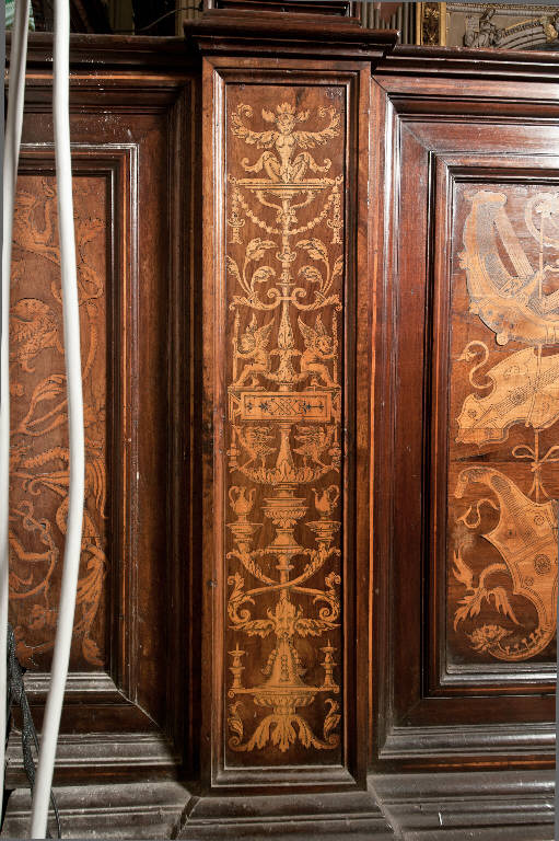 - NOTIZIE STORICO CRITICHE Il piedistallo intarsiato fa parte del coro commissionato nel 1522 dal Consorzio della Misericordia Maggiore di Bergamo al legnaiolo e intarsiatore loverese Giovanni Francesco Capoferri, al quale, alla fine di ottobre, fu affiancato il marangone Giovanni Belli di Ponteranica per i lavori di intaglio. Il progetto della struttura del coro fu messo a punto dallo stesso Capoferri che visitò varie città del Nord-Italia per vedere altri cori intarsiati e che nel luglio-agosto 1523 si recò più volte a Milano dal pittore e architetto trevigliese Bernardo Zenale per sottoporgli il modello del coro. I cartoni delle tarsie figurative che ornano il coro furono affidate in un primo momento (29 ottobre 1523) al poco noto pittore bergamasco Nicolino Cabrini che morì poco dopo: il 12 marzo 1524 fu incaricato al suo posto Lotto, a cui il 2 giugno 1524 il Consorzio richiese anche i pannelli intarsiati ("coperti") che dovevano proteggere le preziose tavolette, i cui soggetti dovevano essere indicati dal principale teologo della città, fra Girolamo Terzi.\nLa struttura del coro è in legno di noce, salvo l'ossatura in legno di conifera. I primi acquisti di legname risalgono al 1523 (cfr. il "Liber fabrice Chori"): insieme al giovanissimo figlio Alessandro, l'intagliatore Giovanni Belli realizzò gran parte della struttura e molte delle decorazioni intagliate. Nel dicembre 1524 il pittore Domenico Petengi d'Albano fu incaricato di realizzare molti dei disegni per gli intagli e le sculture presenti nel coro, ma anche per le tarsie ad arabeschi o a candelabra che andarono a ornare le parti minori del coro: in particolare preparò i cartoni per i pannelli medi e piccoli degli stalli e dell'iconostasi e per i pannelli grandi posti a decorazione del retro del recinto del coro. Nel 1530 anche i pittori Lucano da Imola e Giacomo da Castione fornirono disegni per altri arabeschi intarsiati e ne curarono la profilatura, cioè la rifinitura con tracce grafiche per il completamento del disegno. Anche il Petengi era intervenuto nella profilatura delle tarsie da lui disegnate ma "con grafia alquanto pesante, uniforme e talvolta approssimativa" (Cortesi Bosco, p. 24). La realizzazione di queste tarsie minori spettava al Capoferri, aiutato da altri intasiatori come Paolino da Treviglio che nel 1524 eseguì quattro mezze colonne intarsiate (forse quelle del fronte dell'iconostasi), probabilmente Angelo Ferri, giovane aiuto del Capoferri che morì precocemente durante la peste del 1529 e altri artefici come Alessandro Belli, Giacomo Alberti e Giovan Maria de Marendis, allievo dell'intarsiatore fra Damiano Zambelli. Difficile distinguere, tuttavia, le singole mani nelle varie tarsie decorative del coro. In una lettera del settembre 1527 Lotto diede il suo parere circa il tipo di decorazioni intarsiate da porre sulla parte retrostante del recinto del coro: tali decorazioni dovevano essere "a finto trasforato" con elegante effetto illusionistico, ma, forse perché l'esecuzione dei pannelli era già stata iniziata, il consiglio rimase inascoltato.\nNel 1531 fu deciso di ampliare la struttura del coro, trasferendo le tarsie istoriate del coro degli ecclesiastici ai due bancali dei celebranti e dei Rettori e al coro dei laici nell'abside: nel coro degli ecclesiastici rimasero i soli 'coperti' di soggetto simbolico. Nell'ottobre del 1533, consegnati dal Capoferri gli ultimi pannelli intarsiati, risultano già collocate negli stalli del coro dei religiosi le tarsie 'simboliche' degli ex-coperti, mentre le altre tarsie istoriate sarebbero rimaste per vent'anni nei depositi della Misericordia Maggiore.