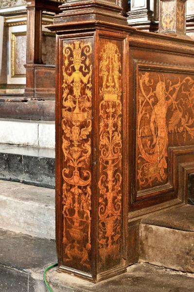 Pilastrino parallelepipedo posto all'estermità della transenna sui gradini di accesso all'abside. Pannelli intarsiati decorati a candelabra su tre facce: su quella interna alla porta, lungo il fusto del candelabro, compaiono putti sorreggenti teste di capri, teste di delfino, mascheroni, animali fantastici, un busto di uomo con tunica; sulla faccia verso la navata, lungo il fusto del candelabro, uccelli, animali fantastici e una coppia di giovani alati con cesto di frutta.