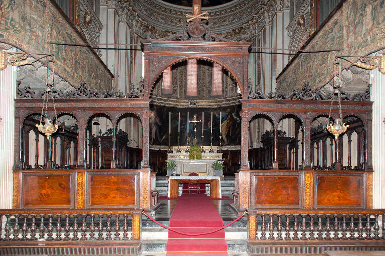 - NOTIZIE STORICO CRITICHE Nel 1522 il Consorzio della Misericordia Maggiore di Bergamo decise di dotare la basilica di Santa Maria di un nuovo coro confacente alla progettata pala d'argento e rame dell'altare maggiore e il 18 settembre di quell'anno deliberò di trattare con il legnaiolo e intarsiatore loverese Giovanni Francesco Capoferri per l'esecuzione dell'opera. L'artefice era noto a Bergamo fin dall'anno precedente per aver collaborato con fra' Damiano Zambelli all'esecuzione del coro intarsiato nella chiesa domenicana di Santo Stefano (ora in San Bartolomeo), inoltre il pittore Lorenzo Lotto gli aveva fatto tradurre in tarsia un suo disegno dell'Annunciazione (poi inserita nel bancale del celebrante, cfr. foto n. 904a) e questa dimostrazione aveva convinto il Consorzio ad affidare il lavoro al loverese. Al Capoferri, direttore dell'impresa del coro, fu affiancato il marangone Giovanni Belli di Ponteranica per i lavori di intaglio. Il principale teologo della città, fra Girolamo Terzi, fu incaricato di fornire le "inventiones" da dare ai pittori che avrebbero disegnato i cartoni da intarsiare. Il progetto della struttura del coro fu messo a punto dallo stesso Capoferri che visitò varie città del Nord-Italia per vedere altri cori intarsiati e che nel luglio-agosto 1523 si recò più volte a Milano dal pittore e architetto trevigliese Bernardo Zenale per sottoporgli il modello del coro. \nDopo aver acquisito alcuni cartoni forniti da pittori diversi, tra cui Lotto, Andrea Previtali, Francesco Rosso di Pavia, il 29 ottobre 1523 il Consorzio affidò i cartoni delle tarsie del coro al pittore bergamasco Nicolino Cabrini, di cui non si conosce nessuna opera se non la profilatura di alcune tarsie e che morì poco dopo, nel gennaio del 1524. Il 12 marzo 1524 il Consorzio incaricò dunque Lorenzo Lotto di eseguire i disegni per le tarsie da inserire negli schienali del coro ligneo della chiesa; dopo pochi mesi (2 giugno 1524) gli commissionò anche i pannelli intarsiati ("coperti") che dovevano proteggere le preziose tavolette. Le tarsie principali sarebbero state policrome, mentre i coperti a monocromo: questi ultimi avrebbero avuto come ornamento immagini simboliche in relazione coi contenuti delle "storie" da proteggere. Lotto inizialmente effettuò anche la 'profilatura' delle tarsie, ovvero la loro rifinitura finale mediante stucco nero per i contorni delle figure e con ombreggiatura a fuoco per il chiaro-scuro, ma un contrasto di natura economica frenò la sua disponibilità: il Consorzio non intendeva riconoscergli un compenso maggiore per le quattro tarsie grandi dell'iconostasi. La profilatura fu allora effettuata dallo stesso Capoferri e dai pittori Andrea Previtali, Ludovico da Mantova e Lucano da Imola. Trasferitosi a Venezia nel dicembre del 1525, il pittore continuò a disegnare i cartoni delle tarsie e a inviarle a Bergamo fino al 1532, realizzando complessivamente 35 tarsie con storie bibliche di cui 4 grandi per l'iconostasi e 31 più piccole collocate oggi negli stalli del coro dei laici e nei due bancali del presbiterio; inoltre eseguì 32 tarsie a soggetto simbolico delle quali 28 costituivano i "coperti" delle tarsie istoriate e che oggi sono inserite negli schienali del coro degli ecclesiastici. \nIl cartone per la tarsia in oggetto, che costituisce il coperto della tarsia con Davide e Golia, fu eseguito da Lotto entro il febbraio 1527: la composizione fu intarsiata dal Capoferri del 1527, forse con l'intervento dell'aiuto Angelo Ferri, e fu da lui profilata e messa in opera entro il marzo 1531. Il senso più ampio dell'impresa va oltre la semplice celebrazione della vittoria di Davide su Golia, ma vi si sottolinea il trionfo del bene su male, di Cristo sul Demonio, dell'uomo di fede sulle tentazioni.\nNel 1531 si decise di ampliare la struttura del coro, trasferendo le tarsie istoriate del coro degli ecclesiastici ai due bancali dei celebranti e dei Rettori e al coro dei laici nell'abside, mentre nel coro dei religiosi rimasero i soli 'coperti' di soggetto simbolico: dei modelletti delle nuove strutture del presbiterio (bancali e coro dei laici) fu incaricato Marcantonio, figlio dell'architetto Pietro Isabello. Solo i grandi quadri istoriati nel fronte dell'iconostasi rimasero con i loro coperti nella collocazione originaria. Nell'ottobre del 1533, consegnati dal Capoferri gli ultimi pannelli intarsiati, risultano già collocate negli stalli del coro dei religiosi le tarsie 'simboliche' degli ex-coperti, mentre le altre tarsie istoriate sarebbero rimaste per vent'anni nei depositi della Misericordia Maggiore.