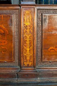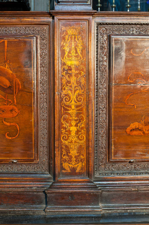 - NOTIZIE STORICO CRITICHE Il piedistallo intarsiato fa parte del coro commissionato nel 1522 dal Consorzio della Misericordia Maggiore di Bergamo al legnaiolo e intarsiatore loverese Giovanni Francesco Capoferri, al quale, alla fine di ottobre, fu affiancato il marangone Giovanni Belli di Ponteranica per i lavori di intaglio. Il progetto della struttura del coro fu messo a punto dallo stesso Capoferri che visitò varie città del Nord-Italia per vedere altri cori intarsiati e che nel luglio-agosto 1523 si recò più volte a Milano dal pittore e architetto trevigliese Bernardo Zenale per sottoporgli il modello del coro. I cartoni delle tarsie figurative che ornano il coro furono affidate in un primo momento (29 ottobre 1523) al poco noto pittore bergamasco Nicolino Cabrini che morì poco dopo: il 12 marzo 1524 fu incaricato al suo posto Lotto, a cui il 2 giugno 1524 il Consorzio richiese anche i pannelli intarsiati ("coperti") che dovevano proteggere le preziose tavolette, i cui soggetti dovevano essere indicati dal principale teologo della città, fra Girolamo Terzi.\nLa struttura del coro è in legno di noce, salvo l'ossatura in legno di conifera. I primi acquisti di legname risalgono al 1523 (cfr. il "Liber fabrice Chori"): insieme al giovanissimo figlio Alessandro, l'intagliatore Giovanni Belli realizzò gran parte della struttura e molte delle decorazioni intagliate. Nel dicembre 1524 il pittore Domenico Petengi d'Albano fu incaricato di realizzare molti dei disegni per gli intagli e le sculture presenti nel coro, ma anche per le tarsie ad arabeschi o a candelabra che andarono a ornare le parti minori del coro: in particolare preparò i cartoni per i pannelli medi e piccoli degli stalli e dell'iconostasi e per i pannelli grandi posti a decorazione del retro del recinto del coro. Nel 1530 anche i pittori Lucano da Imola e Giacomo da Castione fornirono disegni per altri arabeschi intarsiati e ne curarono la profilatura, cioè la rifinitura con tracce grafiche per il completamento del disegno. Anche il Petengi era intervenuto nella profilatura delle tarsie da lui disegnate ma "con grafia alquanto pesante, uniforme e talvolta approssimativa" (Cortesi Bosco, p. 24). La realizzazione di queste tarsie minori spettava al Capoferri, aiutato da altri intasiatori come Paolino da Treviglio che nel 1524 eseguì quattro mezze colonne intarsiate (forse quelle del fronte dell'iconostasi), probabilmente Angelo Ferri, giovane aiuto del Capoferri che morì precocemente durante la peste del 1529 e altri artefici come Alessandro Belli, Giacomo Alberti e Giovan Maria de Marendis, allievo dell'intarsiatore fra Damiano Zambelli. Difficile distinguere, tuttavia, le singole mani nelle varie tarsie decorative del coro. In una lettera del settembre 1527 Lotto diede il suo parere circa il tipo di decorazioni intarsiate da porre sulla parte retrostante del recinto del coro: tali decorazioni dovevano essere "a finto trasforato" con elegante effetto illusionistico, ma, forse perché l'esecuzione dei pannelli era già stata iniziata, il consiglio rimase inascoltato.\nNel 1531 fu deciso di ampliare la struttura del coro, trasferendo le tarsie istoriate del coro degli ecclesiastici ai due bancali dei celebranti e dei Rettori e al coro dei laici nell'abside: nel coro degli ecclesiastici rimasero i soli 'coperti' di soggetto simbolico. Nell'ottobre del 1533, consegnati dal Capoferri gli ultimi pannelli intarsiati, risultano già collocate negli stalli del coro dei religiosi le tarsie 'simboliche' degli ex-coperti, mentre le altre tarsie istoriate sarebbero rimaste per vent'anni nei depositi della Misericordia Maggiore.