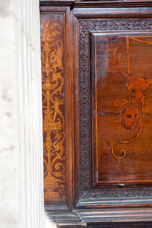 - NOTIZIE STORICO CRITICHE Il piedistallo intarsiato fa parte del coro commissionato nel 1522 dal Consorzio della Misericordia Maggiore di Bergamo al legnaiolo e intarsiatore loverese Giovanni Francesco Capoferri, al quale, alla fine di ottobre, fu affiancato il marangone Giovanni Belli di Ponteranica per i lavori di intaglio. Il progetto della struttura del coro fu messo a punto dallo stesso Capoferri che visitò varie città del Nord-Italia per vedere altri cori intarsiati e che nel luglio-agosto 1523 si recò più volte a Milano dal pittore e architetto trevigliese Bernardo Zenale per sottoporgli il modello del coro. I cartoni delle tarsie figurative che ornano il coro furono affidate in un primo momento (29 ottobre 1523) al poco noto pittore bergamasco Nicolino Cabrini che morì poco dopo: il 12 marzo 1524 fu incaricato al suo posto Lotto, a cui il 2 giugno 1524 il Consorzio richiese anche i pannelli intarsiati ("coperti") che dovevano proteggere le preziose tavolette, i cui soggetti dovevano essere indicati dal principale teologo della città, fra Girolamo Terzi.\nLa struttura del coro è in legno di noce, salvo l'ossatura in legno di conifera. I primi acquisti di legname risalgono al 1523 (cfr. il "Liber fabrice Chori"): insieme al giovanissimo figlio Alessandro, l'intagliatore Giovanni Belli realizzò gran parte della struttura e molte delle decorazioni intagliate. Nel dicembre 1524 il pittore Domenico Petengi d'Albano fu incaricato di realizzare molti dei disegni per gli intagli e le sculture presenti nel coro, ma anche per le tarsie ad arabeschi o a candelabra che andarono a ornare le parti minori del coro: in particolare preparò i cartoni per i pannelli medi e piccoli degli stalli e dell'iconostasi e per i pannelli grandi posti a decorazione del retro del recinto del coro. Nel 1530 anche i pittori Lucano da Imola e Giacomo da Castione fornirono disegni per altri arabeschi intarsiati e ne curarono la profilatura, cioè la rifinitura con tracce grafiche per il completamento del disegno. Anche il Petengi era intervenuto nella profilatura delle tarsie da lui disegnate ma "con grafia alquanto pesante, uniforme e talvolta approssimativa" (Cortesi Bosco, p. 24). La realizzazione di queste tarsie minori spettava al Capoferri, aiutato da altri intasiatori come Paolino da Treviglio che nel 1524 eseguì quattro mezze colonne intarsiate (forse quelle del fronte dell'iconostasi), probabilmente Angelo Ferri, giovane aiuto del Capoferri che morì precocemente durante la peste del 1529 e altri artefici come Alessandro Belli, Giacomo Alberti e Giovan Maria de Marendis, allievo dell'intarsiatore fra Damiano Zambelli. Difficile distinguere, tuttavia, le singole mani nelle varie tarsie decorative del coro. In una lettera del settembre 1527 Lotto diede il suo parere circa il tipo di decorazioni intarsiate da porre sulla parte retrostante del recinto del coro: tali decorazioni dovevano essere "a finto trasforato" con elegante effetto illusionistico, ma, forse perché l'esecuzione dei pannelli era già stata iniziata, il consiglio rimase inascoltato.\nNel 1531 fu deciso di ampliare la struttura del coro, trasferendo le tarsie istoriate del coro degli ecclesiastici ai due bancali dei celebranti e dei Rettori e al coro dei laici nell'abside: nel coro degli ecclesiastici rimasero i soli 'coperti' di soggetto simbolico. Nell'ottobre del 1533, consegnati dal Capoferri gli ultimi pannelli intarsiati, risultano già collocate negli stalli del coro dei religiosi le tarsie 'simboliche' degli ex-coperti, mentre le altre tarsie istoriate sarebbero rimaste per vent'anni nei depositi della Misericordia Maggiore.