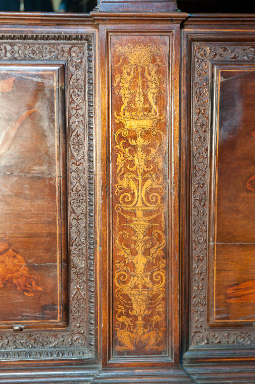 - NOTIZIE STORICO CRITICHE Il piedistallo intarsiato fa parte del coro commissionato nel 1522 dal Consorzio della Misericordia Maggiore di Bergamo al legnaiolo e intarsiatore loverese Giovanni Francesco Capoferri, al quale, alla fine di ottobre, fu affiancato il marangone Giovanni Belli di Ponteranica per i lavori di intaglio. Il progetto della struttura del coro fu messo a punto dallo stesso Capoferri che visitò varie città del Nord-Italia per vedere altri cori intarsiati e che nel luglio-agosto 1523 si recò più volte a Milano dal pittore e architetto trevigliese Bernardo Zenale per sottoporgli il modello del coro. I cartoni delle tarsie figurative che ornano il coro furono affidate in un primo momento (29 ottobre 1523) al poco noto pittore bergamasco Nicolino Cabrini che morì poco dopo: il 12 marzo 1524 fu incaricato al suo posto Lotto, a cui il 2 giugno 1524 il Consorzio richiese anche i pannelli intarsiati ("coperti") che dovevano proteggere le preziose tavolette, i cui soggetti dovevano essere indicati dal principale teologo della città, fra Girolamo Terzi.\nLa struttura del coro è in legno di noce, salvo l'ossatura in legno di conifera. I primi acquisti di legname risalgono al 1523 (cfr. il "Liber fabrice Chori"): insieme al giovanissimo figlio Alessandro, l'intagliatore Giovanni Belli realizzò gran parte della struttura e molte delle decorazioni intagliate. Nel dicembre 1524 il pittore Domenico Petengi d'Albano fu incaricato di realizzare molti dei disegni per gli intagli e le sculture presenti nel coro, ma anche per le tarsie ad arabeschi o a candelabra che andarono a ornare le parti minori del coro: in particolare preparò i cartoni per i pannelli medi e piccoli degli stalli e dell'iconostasi e per i pannelli grandi posti a decorazione del retro del recinto del coro. Nel 1530 anche i pittori Lucano da Imola e Giacomo da Castione fornirono disegni per altri arabeschi intarsiati e ne curarono la profilatura, cioè la rifinitura con tracce grafiche per il completamento del disegno. Anche il Petengi era intervenuto nella profilatura delle tarsie da lui disegnate ma "con grafia alquanto pesante, uniforme e talvolta approssimativa" (Cortesi Bosco, p. 24). La realizzazione di queste tarsie minori spettava al Capoferri, aiutato da altri intasiatori come Paolino da Treviglio che nel 1524 eseguì quattro mezze colonne intarsiate (forse quelle del fronte dell'iconostasi), probabilmente Angelo Ferri, giovane aiuto del Capoferri che morì precocemente durante la peste del 1529 e altri artefici come Alessandro Belli, Giacomo Alberti e Giovan Maria de Marendis, allievo dell'intarsiatore fra Damiano Zambelli. Difficile distinguere, tuttavia, le singole mani nelle varie tarsie decorative del coro. In una lettera del settembre 1527 Lotto diede il suo parere circa il tipo di decorazioni intarsiate da porre sulla parte retrostante del recinto del coro: tali decorazioni dovevano essere "a finto trasforato" con elegante effetto illusionistico, ma, forse perché l'esecuzione dei pannelli era già stata iniziata, il consiglio rimase inascoltato.\nNel 1531 fu deciso di ampliare la struttura del coro, trasferendo le tarsie istoriate del coro degli ecclesiastici ai due bancali dei celebranti e dei Rettori e al coro dei laici nell'abside: nel coro degli ecclesiastici rimasero i soli 'coperti' di soggetto simbolico. Nell'ottobre del 1533, consegnati dal Capoferri gli ultimi pannelli intarsiati, risultano già collocate negli stalli del coro dei religiosi le tarsie 'simboliche' degli ex-coperti, mentre le altre tarsie istoriate sarebbero rimaste per vent'anni nei depositi della Misericordia Maggiore.