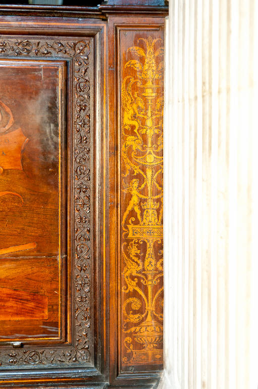 - NOTIZIE STORICO CRITICHE Il piedistallo intarsiato fa parte del coro commissionato nel 1522 dal Consorzio della Misericordia Maggiore di Bergamo al legnaiolo e intarsiatore loverese Giovanni Francesco Capoferri, al quale, alla fine di ottobre, fu affiancato il marangone Giovanni Belli di Ponteranica per i lavori di intaglio. Il progetto della struttura del coro fu messo a punto dallo stesso Capoferri che visitò varie città del Nord-Italia per vedere altri cori intarsiati e che nel luglio-agosto 1523 si recò più volte a Milano dal pittore e architetto trevigliese Bernardo Zenale per sottoporgli il modello del coro. I cartoni delle tarsie figurative che ornano il coro furono affidate in un primo momento (29 ottobre 1523) al poco noto pittore bergamasco Nicolino Cabrini che morì poco dopo: il 12 marzo 1524 fu incaricato al suo posto Lotto, a cui il 2 giugno 1524 il Consorzio richiese anche i pannelli intarsiati ("coperti") che dovevano proteggere le preziose tavolette, i cui soggetti dovevano essere indicati dal principale teologo della città, fra Girolamo Terzi.\nLa struttura del coro è in legno di noce, salvo l'ossatura in legno di conifera. I primi acquisti di legname risalgono al 1523 (cfr. il "Liber fabrice Chori"): insieme al giovanissimo figlio Alessandro, l'intagliatore Giovanni Belli realizzò gran parte della struttura e molte delle decorazioni intagliate. Nel dicembre 1524 il pittore Domenico Petengi d'Albano fu incaricato di realizzare molti dei disegni per gli intagli e le sculture presenti nel coro, ma anche per le tarsie ad arabeschi o a candelabra che andarono a ornare le parti minori del coro: in particolare preparò i cartoni per i pannelli medi e piccoli degli stalli e dell'iconostasi e per i pannelli grandi posti a decorazione del retro del recinto del coro. Nel 1530 anche i pittori Lucano da Imola e Giacomo da Castione fornirono disegni per altri arabeschi intarsiati e ne curarono la profilatura, cioè la rifinitura con tracce grafiche per il completamento del disegno. Anche il Petengi era intervenuto nella profilatura delle tarsie da lui disegnate ma "con grafia alquanto pesante, uniforme e talvolta approssimativa" (Cortesi Bosco, p. 24). La realizzazione di queste tarsie minori spettava al Capoferri, aiutato da altri intasiatori come Paolino da Treviglio che nel 1524 eseguì quattro mezze colonne intarsiate (forse quelle del fronte dell'iconostasi), probabilmente Angelo Ferri, giovane aiuto del Capoferri che morì precocemente durante la peste del 1529 e altri artefici come Alessandro Belli, Giacomo Alberti e Giovan Maria de Marendis, allievo dell'intarsiatore fra Damiano Zambelli. Difficile distinguere, tuttavia, le singole mani nelle varie tarsie decorative del coro. In una lettera del settembre 1527 Lotto diede il suo parere circa il tipo di decorazioni intarsiate da porre sulla parte retrostante del recinto del coro: tali decorazioni dovevano essere "a finto trasforato" con elegante effetto illusionistico, ma, forse perché l'esecuzione dei pannelli era già stata iniziata, il consiglio rimase inascoltato.\nNel 1531 fu deciso di ampliare la struttura del coro, trasferendo le tarsie istoriate del coro degli ecclesiastici ai due bancali dei celebranti e dei Rettori e al coro dei laici nell'abside: nel coro degli ecclesiastici rimasero i soli 'coperti' di soggetto simbolico. Nell'ottobre del 1533, consegnati dal Capoferri gli ultimi pannelli intarsiati, risultano già collocate negli stalli del coro dei religiosi le tarsie 'simboliche' degli ex-coperti, mentre le altre tarsie istoriate sarebbero rimaste per vent'anni nei depositi della Misericordia Maggiore.